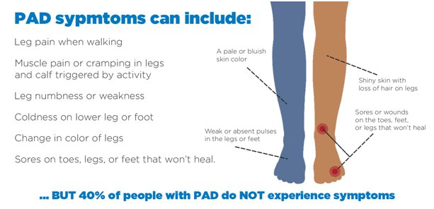 PAD usually is asymptomatic affecting not less than 25% of elderly people. For the active and mobile people, it usually presents as Intermittent Claudication ( Calf pain that occurs only on walking and is relieved by a few minutes rest and again recurring after walking the same distance). Untreated, PAD progresses to Gangrene of the toes and ultimately major leg amputation.