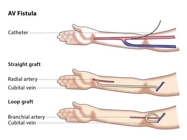 Access can be from Upper limbs (AVF – Arterio-venous Fistula), Permcaths (long-term Tunnelled dialysis catheters), AV- Grafts.